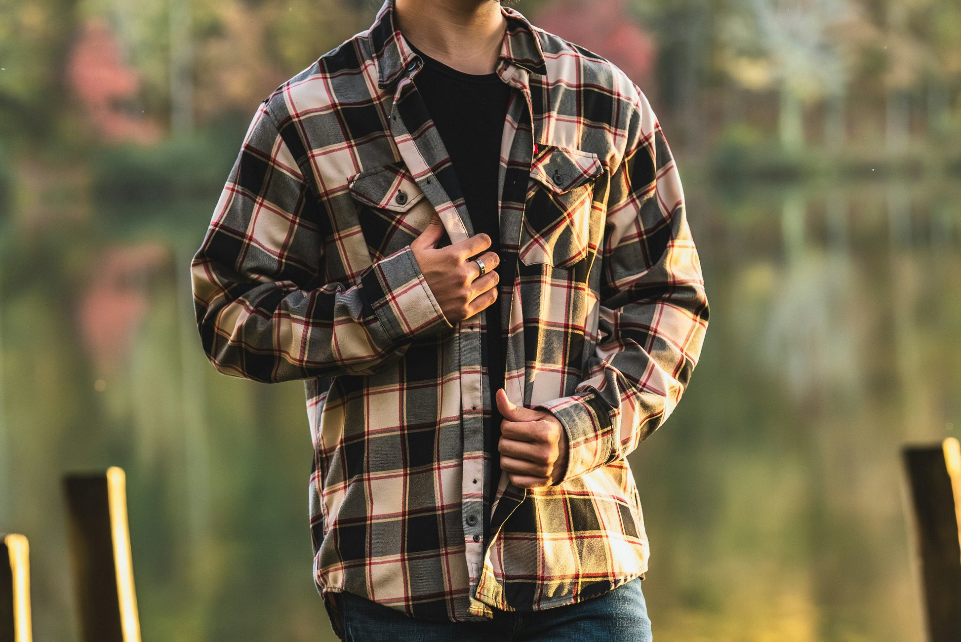 Camisa manga larga de color beige, rayas rojas con cuadros negros. Con dos bolsillos delanteros.