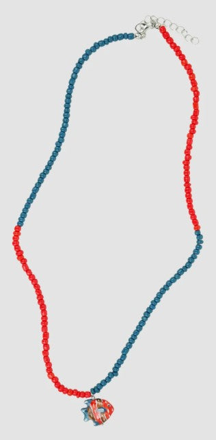 Es un collar corto, tipo gargantilla, hecho principalmente de pequeñas cuentas o mostacillas. El diseño de la cadena es de bloques de color: la mitad es de color rojo y la otra mitad es de color celeste.